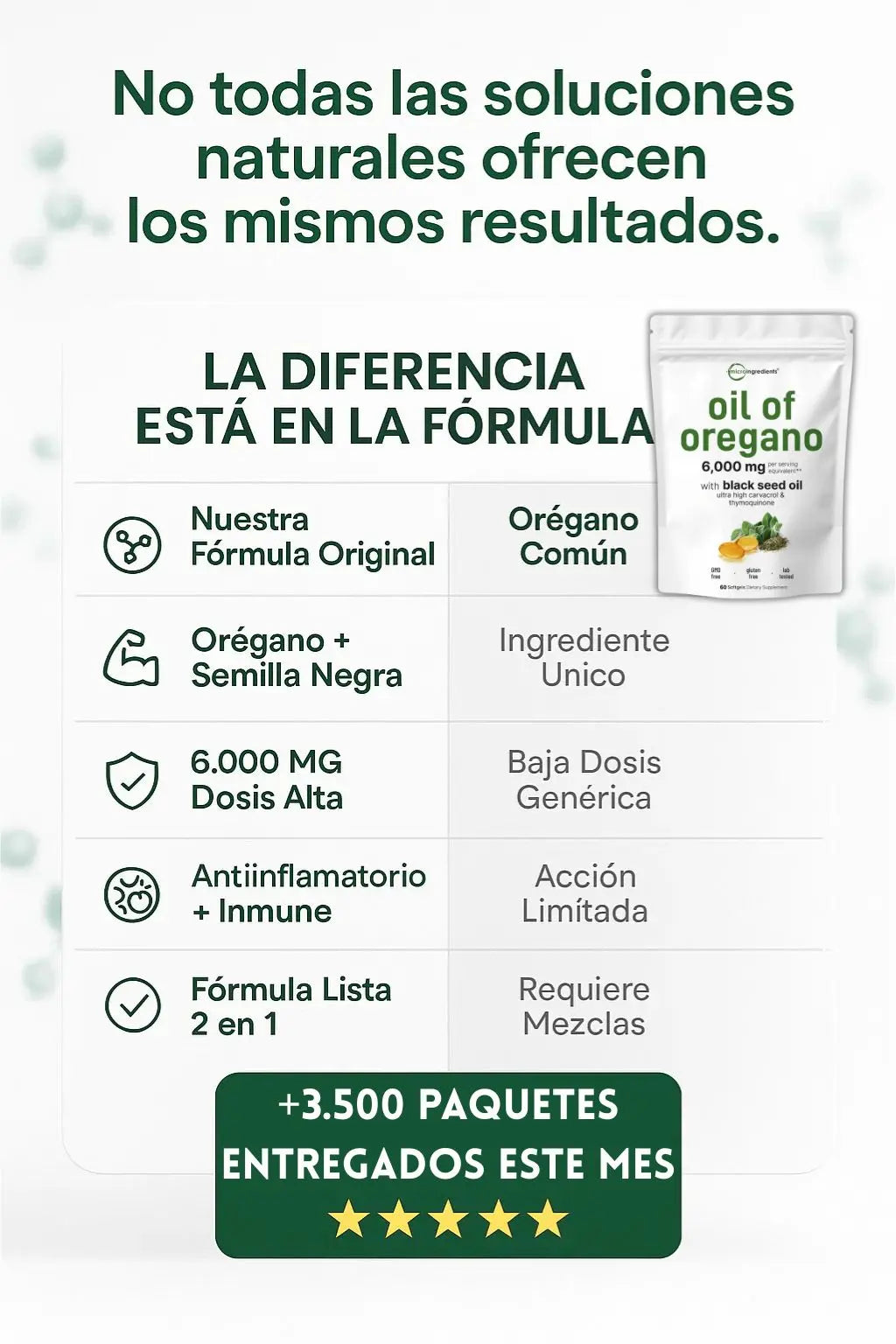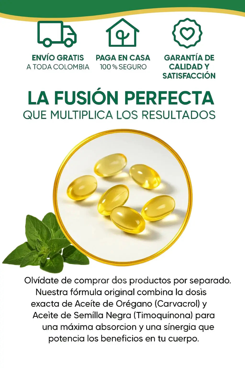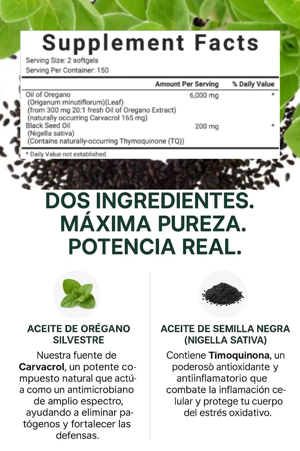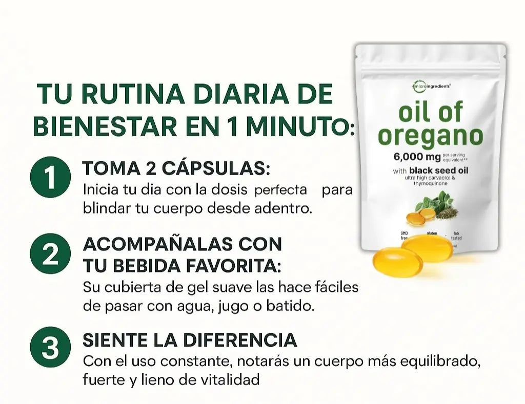 Este suplemento combina las propiedades antibacterianas y antivirales del aceite de orégano con el poder antiinflamatorio y antioxidante del aceite de semilla negra. Juntos ayudan a fortalecer el sistema inmunológico, apoyar la salud digestiva y combatir infecciones naturales.