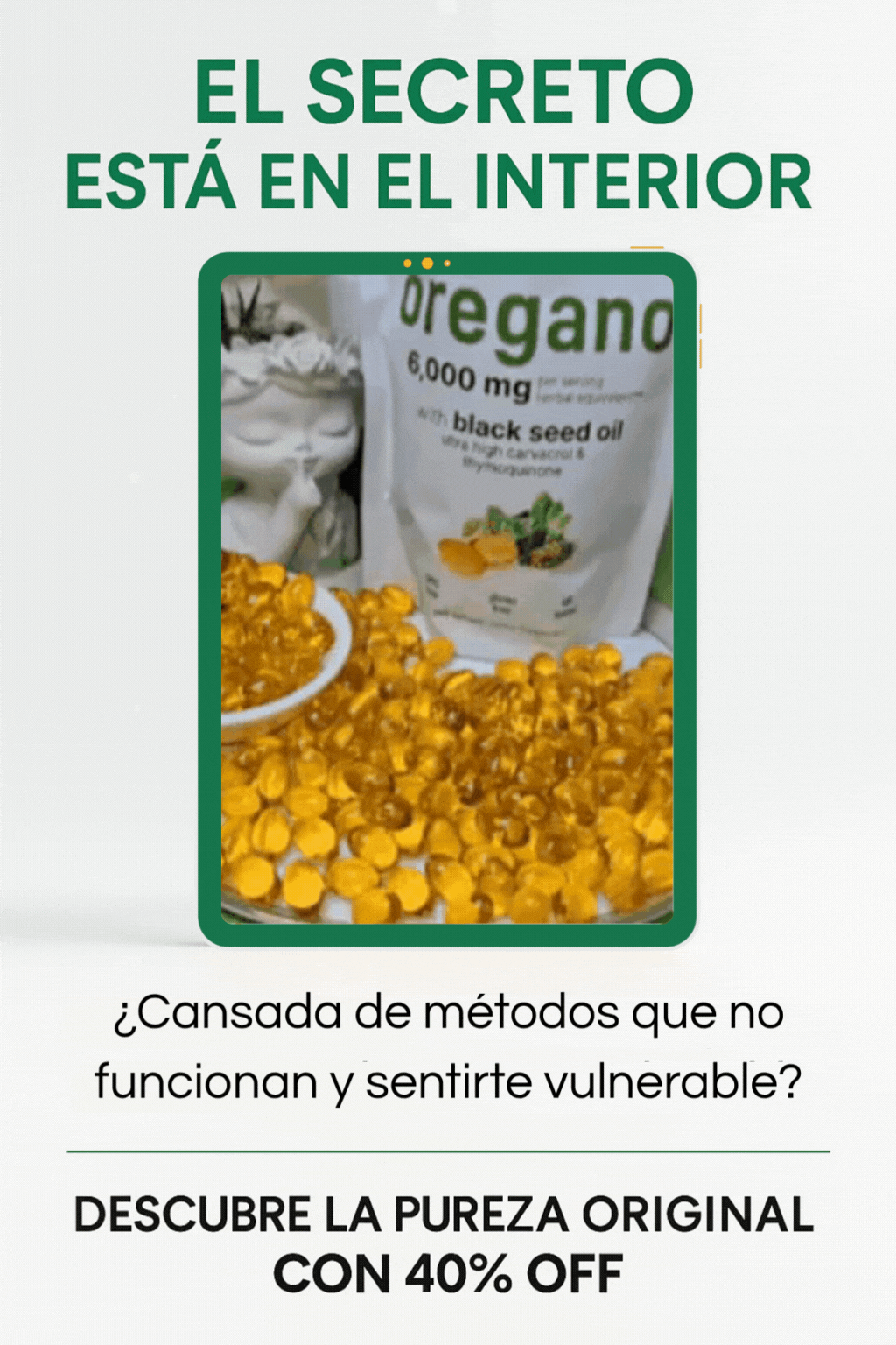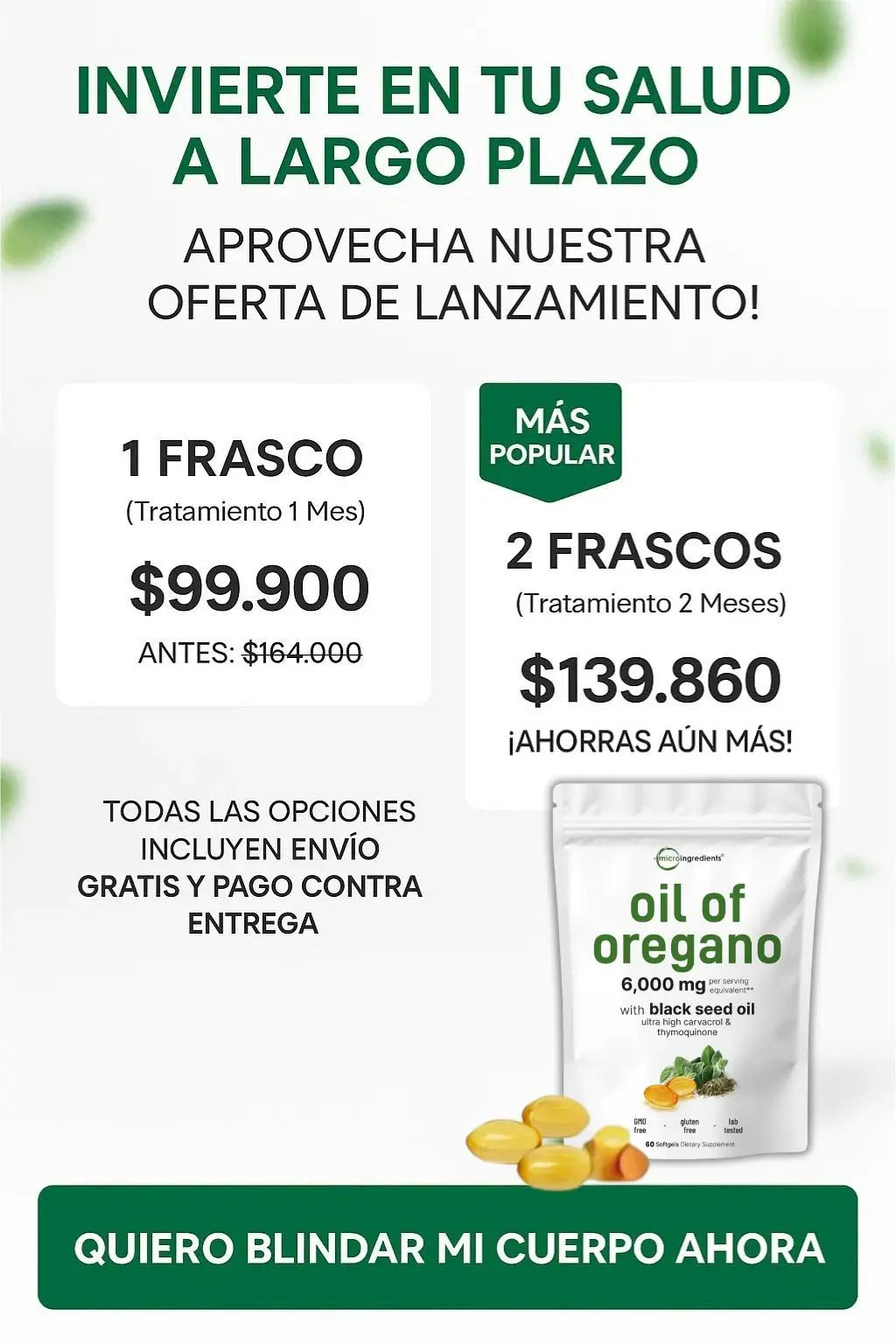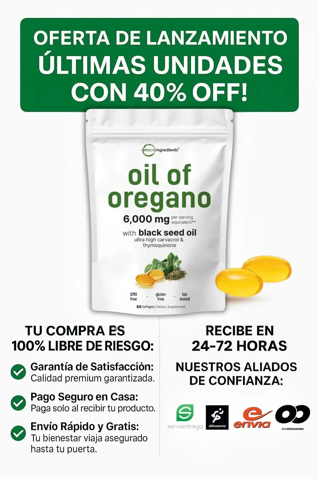 Este suplemento combina las propiedades antibacterianas y antivirales del aceite de orégano con el poder antiinflamatorio y antioxidante del aceite de semilla negra. Juntos ayudan a fortalecer el sistema inmunológico, apoyar la salud digestiva y combatir infecciones naturales.