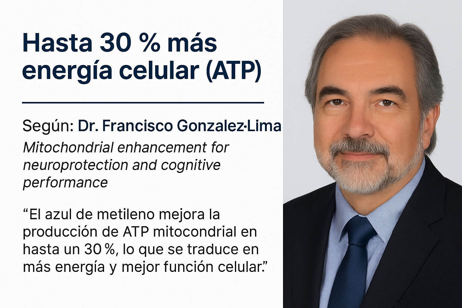 El Azul de Metileno actúa a nivel celular, mejorando el uso del oxígeno y aumentando la producción de energía (ATP). Esto se traduce en más enfoque, mejor ánimo y mayor vitalidad. Es como darle un "reseteo" bioquímico al cuerpo.
