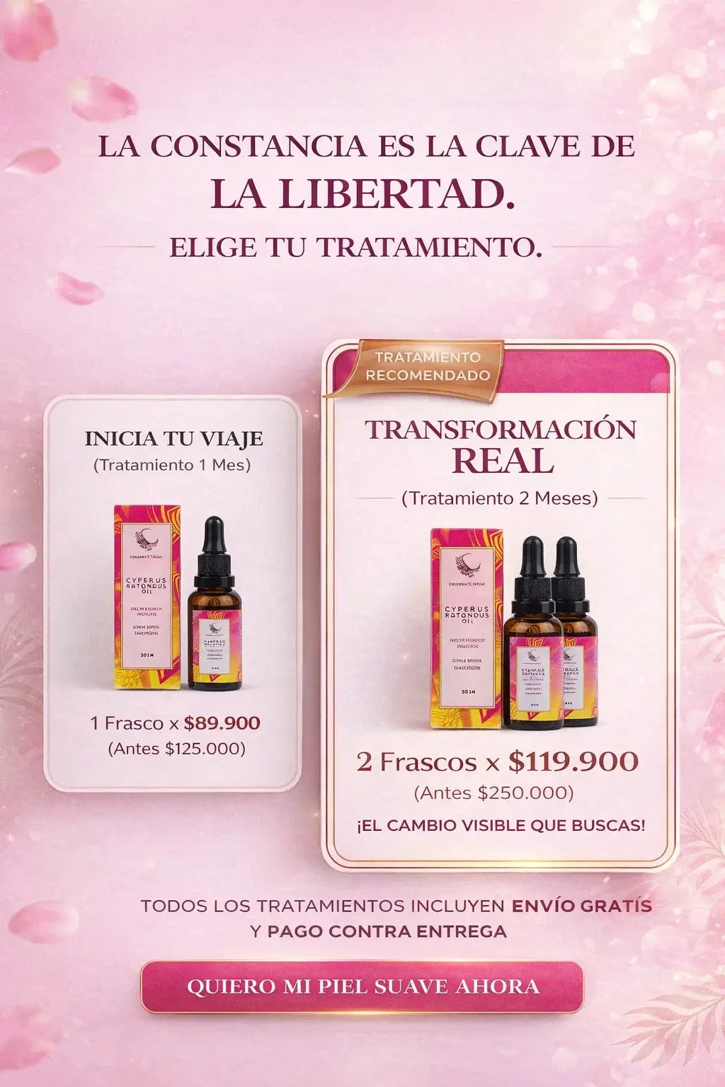 Está formulado principalmente con extracto de Cyperus Rotundus (nutgrass), combinado con aceites naturales como jojoba, almendra dulce, rosa mosqueta, y extractos calmantes como árbol de té y aloe vera.