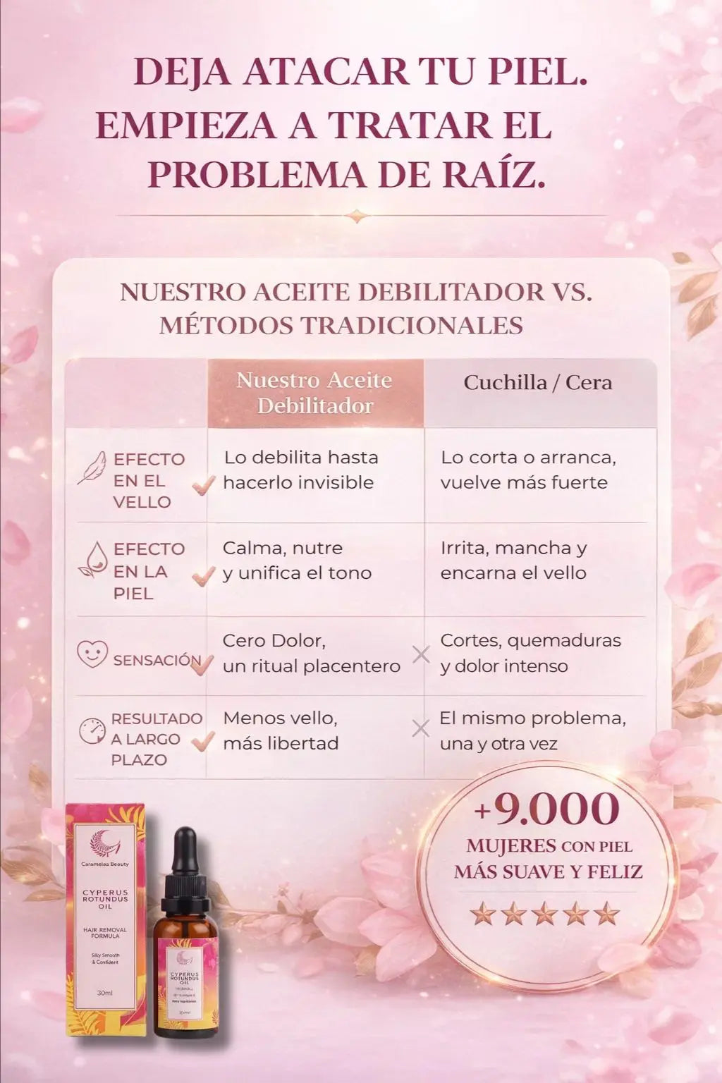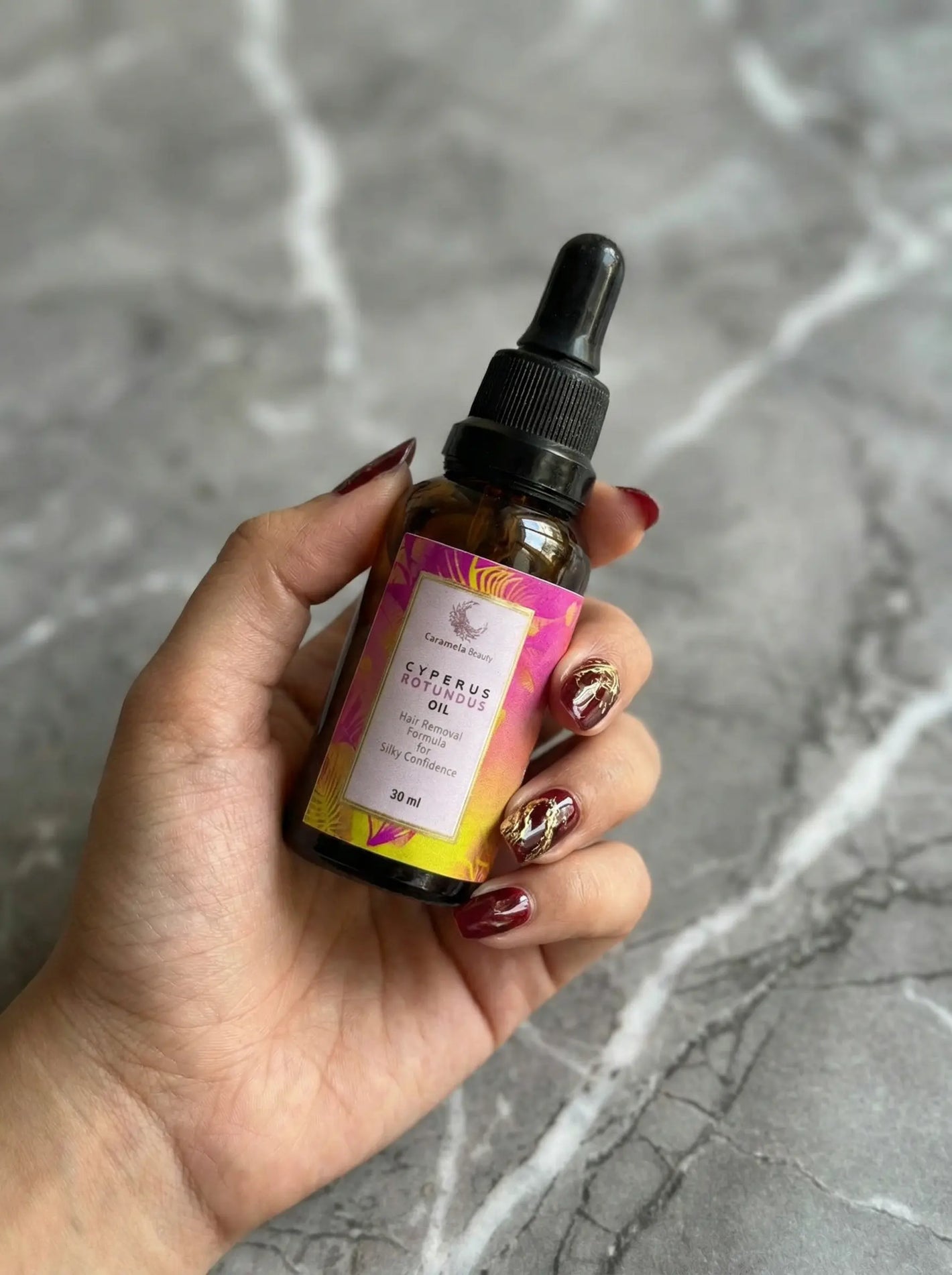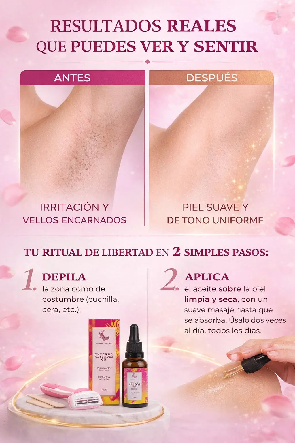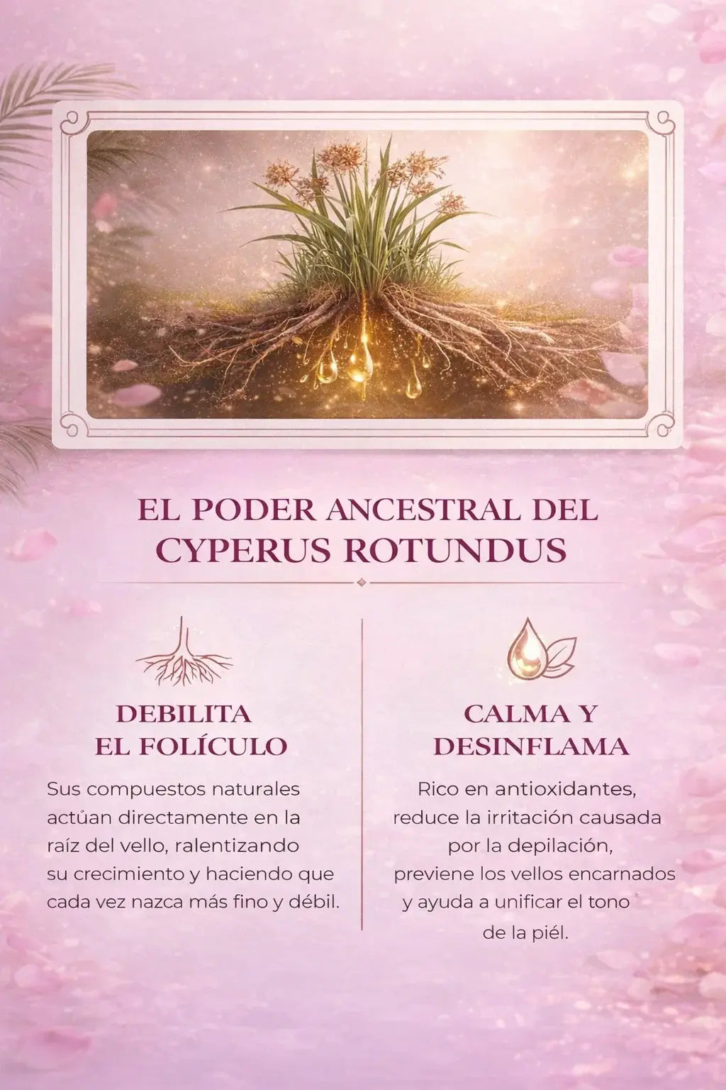 El Cyperus Rotundus es una planta natural conocida por ayudar a ralentizar el crecimiento del vello corporal cuando se aplica de forma tópica. Además, tiene propiedades calmantes que ayudan a cuidar la piel después de la depilación, reduciendo la irritación y la sensación de ardor.